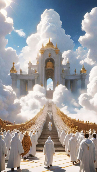 Kísérete bizonyos távolságból követi, a ragyogó fény miatt, mely Őt övezi. Ruházatuk hasonlatos az Úr Jézuséhoz, de ezen nincsenek élő képek. Az alsó viseletük színes. Az elmúlt korok nagy prófétái, királyai ők, akik sokat tettek a Földért. Itt is ragyogó szépségű angyali sorfal áll, de ők fénylő arany ruhát viselnek.